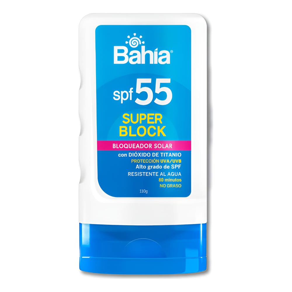 Bahía Super Block SPF 55 posee una fórmula especial para proteger la piel de las radiaciones solares (UVA y UVB). Ayuda a prevenir el eritema solar, gracias a su alto grado de SPF. Retiene por 80 minutos su SPF en actividad en el agua o transpiración.